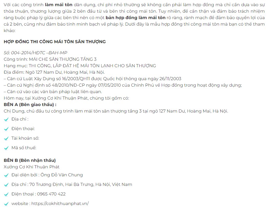 Mẫu hợp đồng làm mái tôn cho nhà dân